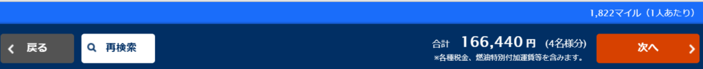 こちらはチケット代、各種税金、燃油特別付加運賃すべて込みの家族4人の値段で166,440円となります。