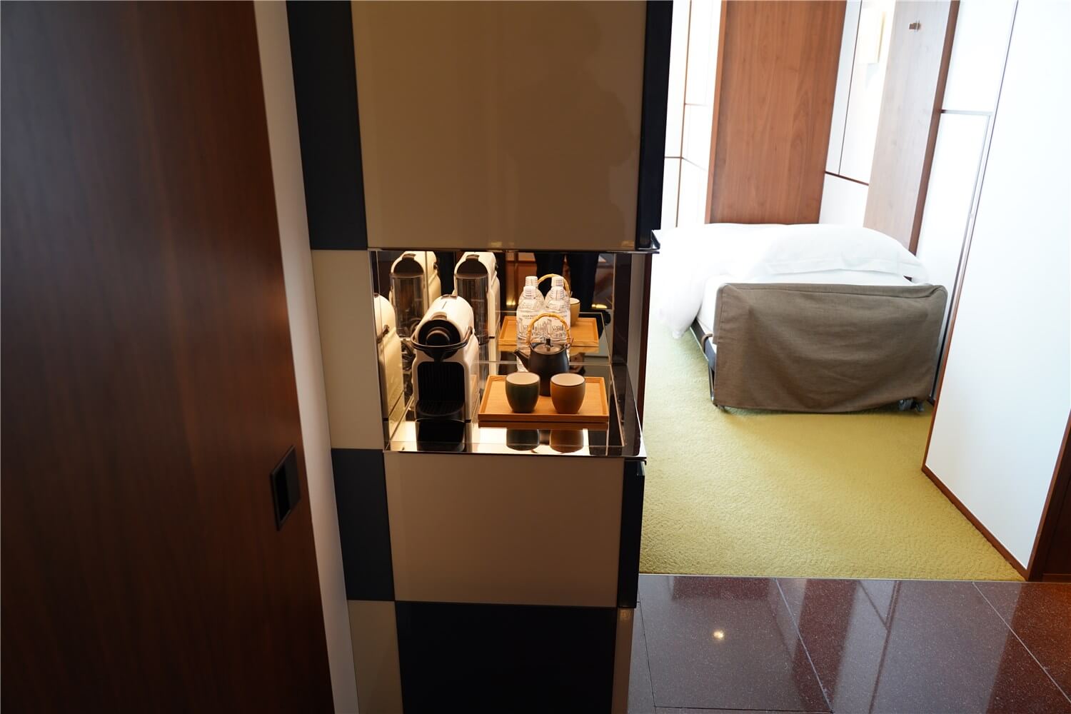 ミニバーはベッドルームと手前の玄関周りの境目にあります。