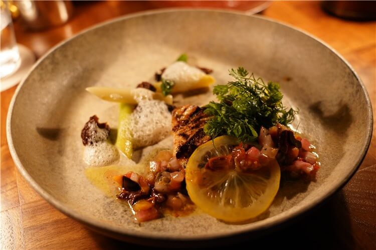 - 鮮魚のグリル モリーユ茸とグリーンアスパラガスのソテー