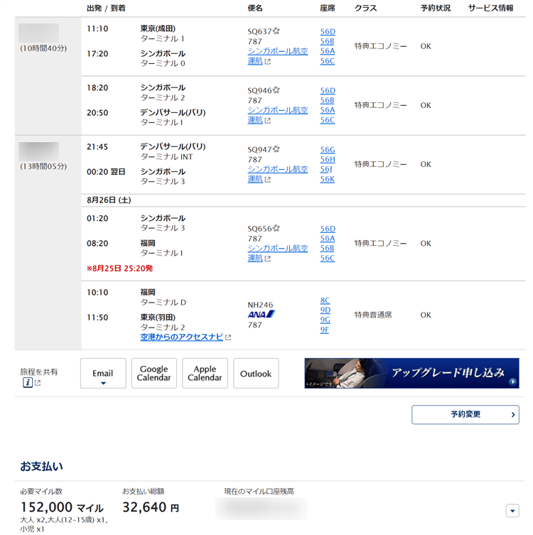 | フライト代 | 152,000ANAマイルと32,600円 |