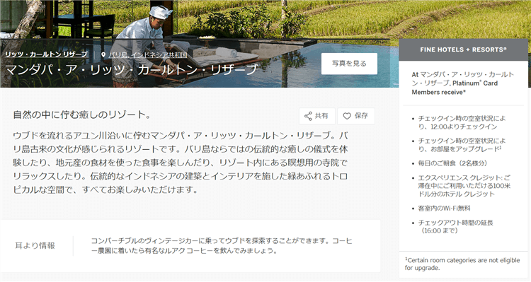 | 8/19-21 | マンダパ・リッツ・カールトン・リザーブ レインフォレスト1ベッドルームヴィラ(キャッシュの場合約37万円) スタンダードルームであれば1泊110,000ポイント~ | 115,000ポイント+キャッシュ370,000円 |