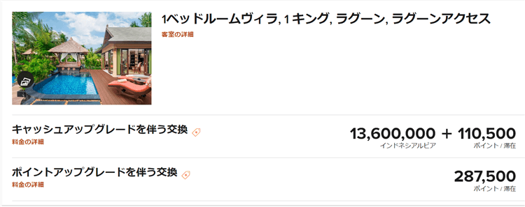 | 8/23-25 | セントレジスバリリゾート 1ベッドルームヴィラ, 1 キング, ラグーン, ラグーンアクセス(キャッシュの場合約24万円) スタンダードルームであれば1泊110,000ポイント~ | 110,000ポイント×2+140,000円 |