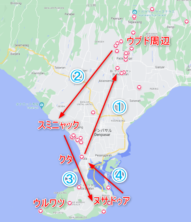 最初にウブド周辺を楽しみ、そこから都会であるスミニャックに移動して街を楽しむ。