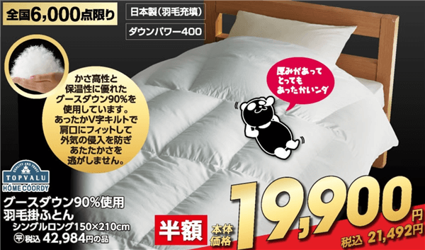 日々の食品も大安売りしますが、家電や寝具も安くなります!!羽毛布団は半額!!