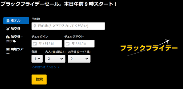まずは格安ホテル、旅行などを扱う世界最大のサイト「エクスペディア」のブラックフライデーセール!
