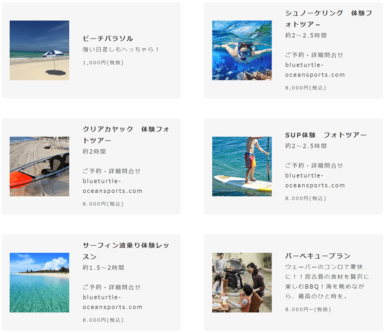 ビーチパラソルのレンタルから、カヤック、シュノーケリング、SUPなどの体験フォトツアーも実施しているみたいです。