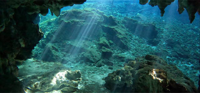 そしてここのセノーテの最大の魅力は、太陽の陽射しで見える光のカーテン。