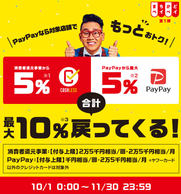 PayPayを利用してキャッシュレス対象店舗でお買い物をすると、ポイント還元事業からの最大5%に加えて、PayPayから最大5%のポイントが戻ってきます!