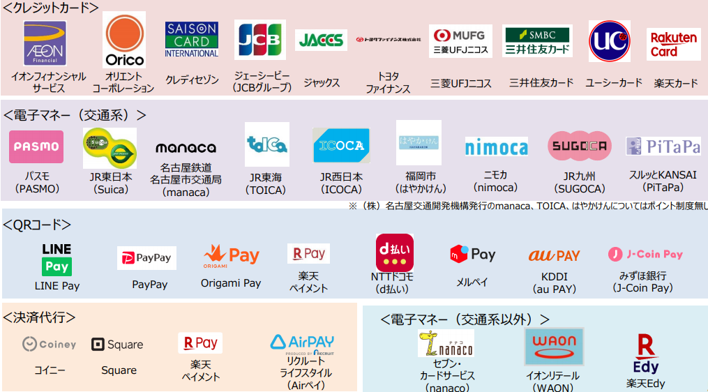 今回のポイント還元事業、政府がキャッシュレス決済の普及を目指していることもあり、非常に数多くのキャッシュレス決済事業者が対象となっています。