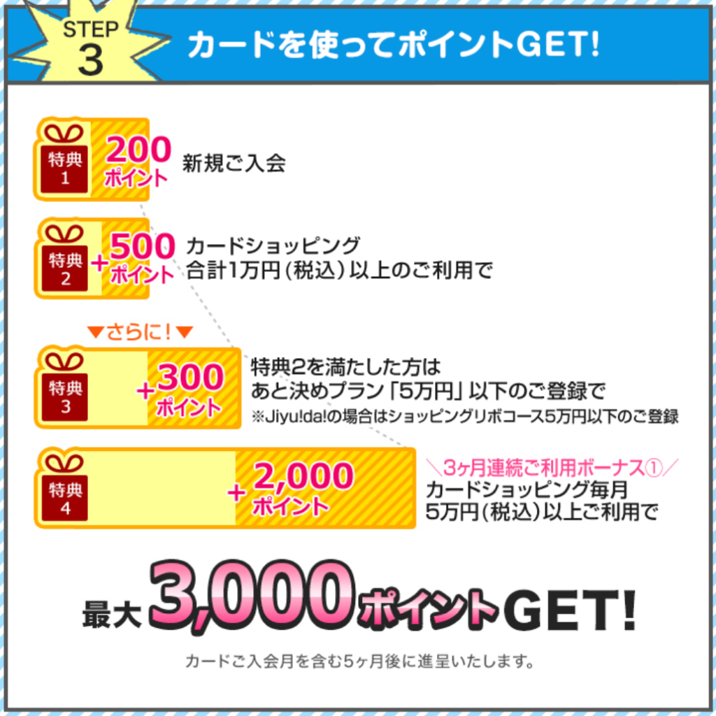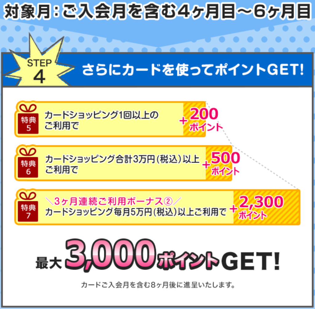 - 特典4 カードショッピング3か月連続5万円(税込)以上の利用:2,000ポイント