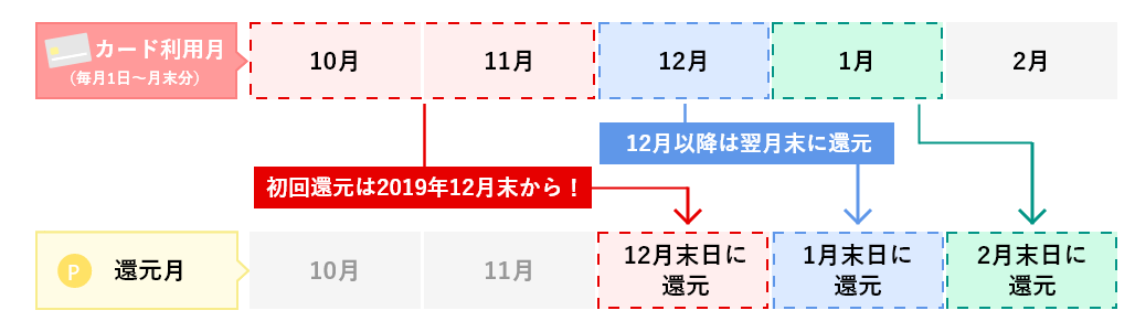ポイント付与のタイミングが、初回還元が12月末日から。10月分11月分が付与されます。