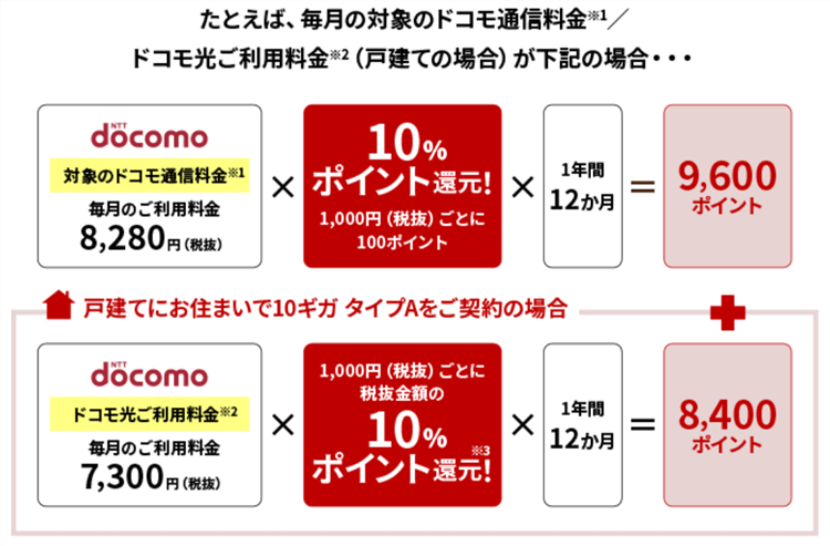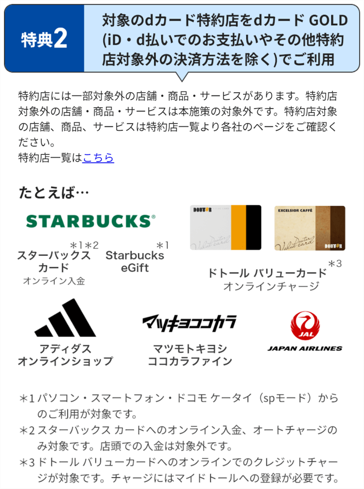 - dカード GOLD:ご利用金額の10%のdポイント(期間・用途限定)を進呈
