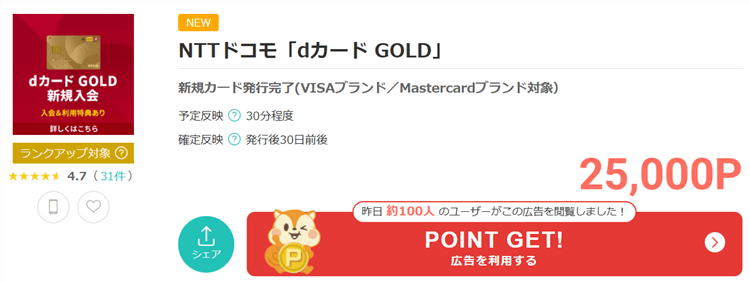 こちらはdカード GOLDの新規発行で25,000ポイント(25,000円相当)が貰えちゃいます。