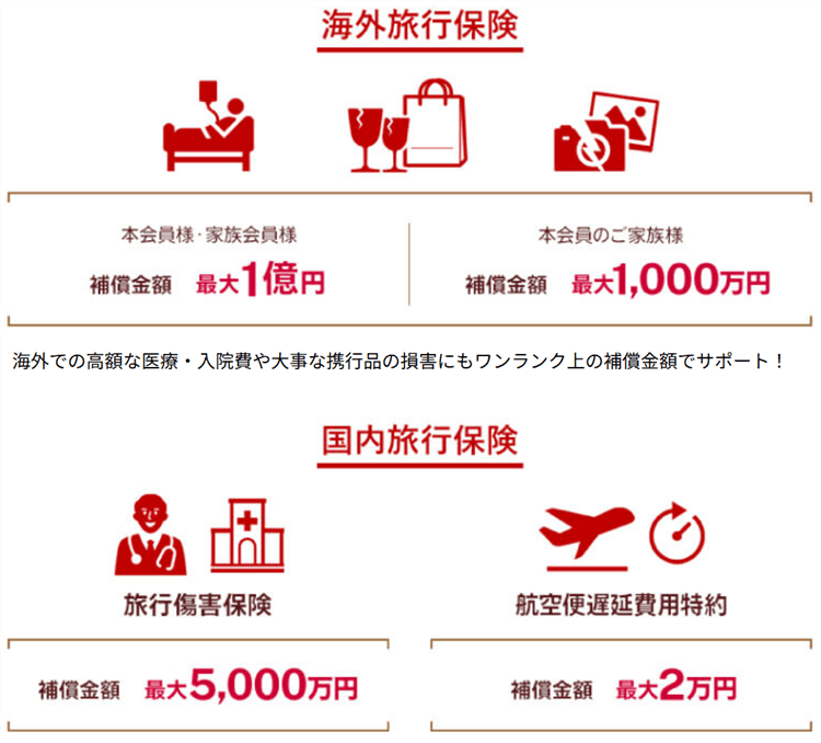 | カード補償 | 海外旅行保険最大1億円、国内旅行保険最大5,000万円、海外航空便遅延費用特約・家族特約、国内航空便遅延費用特約、ケータイ補償 最大10万円補償・補償期間3年、お買物あんしん保険 年間300万円まで |
