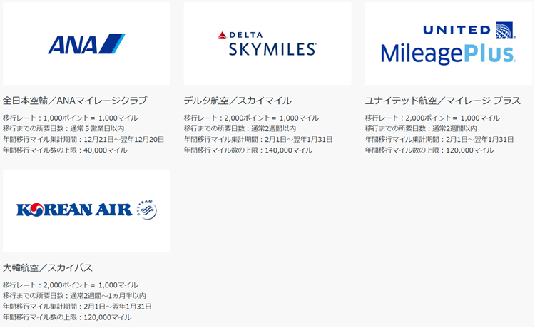 ただし、各エアラインに移行できるマイル数の上限もありますので、ご注意ください。