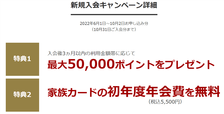 入会特典1!入会後3か月以内の利用額に応じて最大50,000ポイントが貰える!