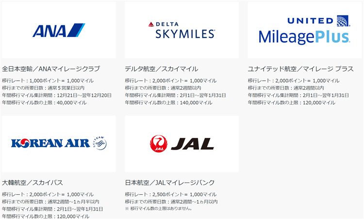 ただし、各エアラインに移行できるマイル数の上限もありますので、ご注意ください。