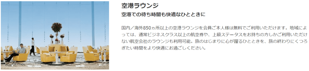 そして、通常ビジネスクラス以上の航空券や、上級ステータスをお持ちの方しかご利用いただけない航空会社のラウンジも利用可能なので、めちゃお得に旅をアシストしてくれますね!!