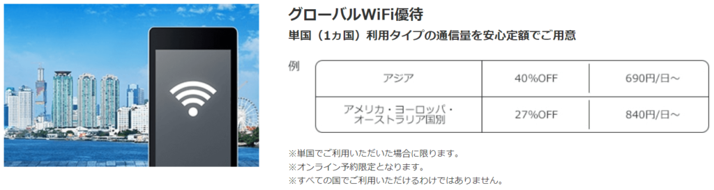 その他にも、グローバルWiFiレンタルの優待や、パッケージツア割引などもあります。
