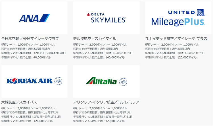 ただし、各エアラインに移行できるマイル数の上限もありますので、ご注意ください。