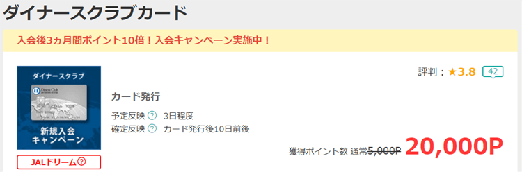- ダイナースクラブカード(モッピー):20,000P(20,000円相当or17,250ANAマイルor16,000JALマイル)
