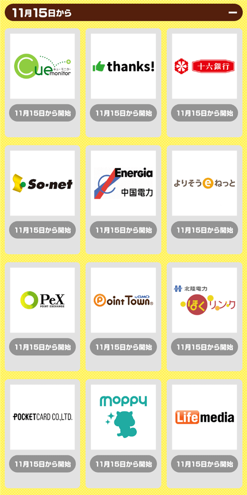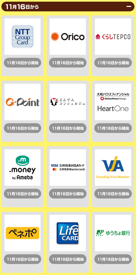 続いて11/16からキャンペーンスタートするのがこちらの12社になります。