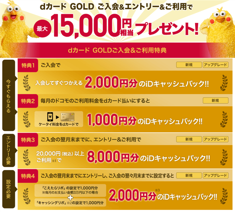 dポイント20%増量キャンペーンの参加条件でもあるdカードゴールドなら発行で12,000P!!更に最大15,000円相当も合わせてGET!!