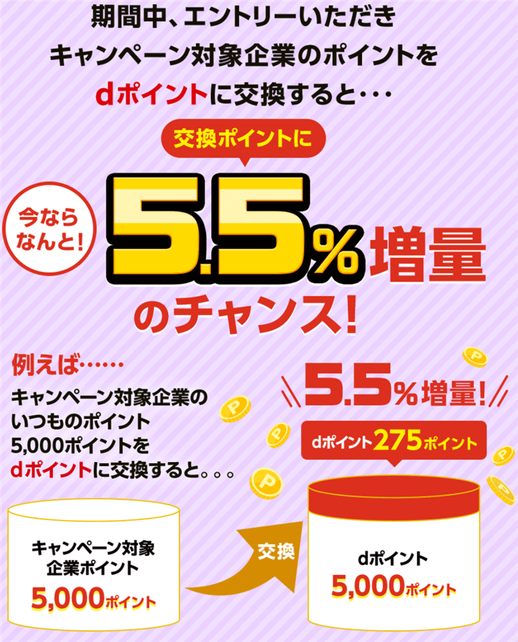 期間中に、キャンペーンサイトから本キャンペーンへエントリーし、本キャンペーン対象企業のポイントからdポイントへの交換をお申込みいただいたお客さまへ、dポイントへの交換が完了したポイントの5.5%相当をキャンペーンポイントとして進呈します。なお、ポイント交換のお申込みと本キャンペーンへのエントリーの順序は問いません。