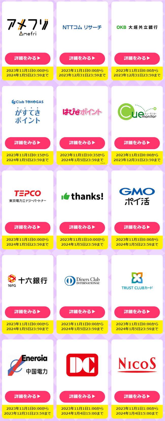 ポイント交換は、システム連携上、2023年11月1日(水)10:35~2024年1月6月(土)10:34の受付分が対象となります。