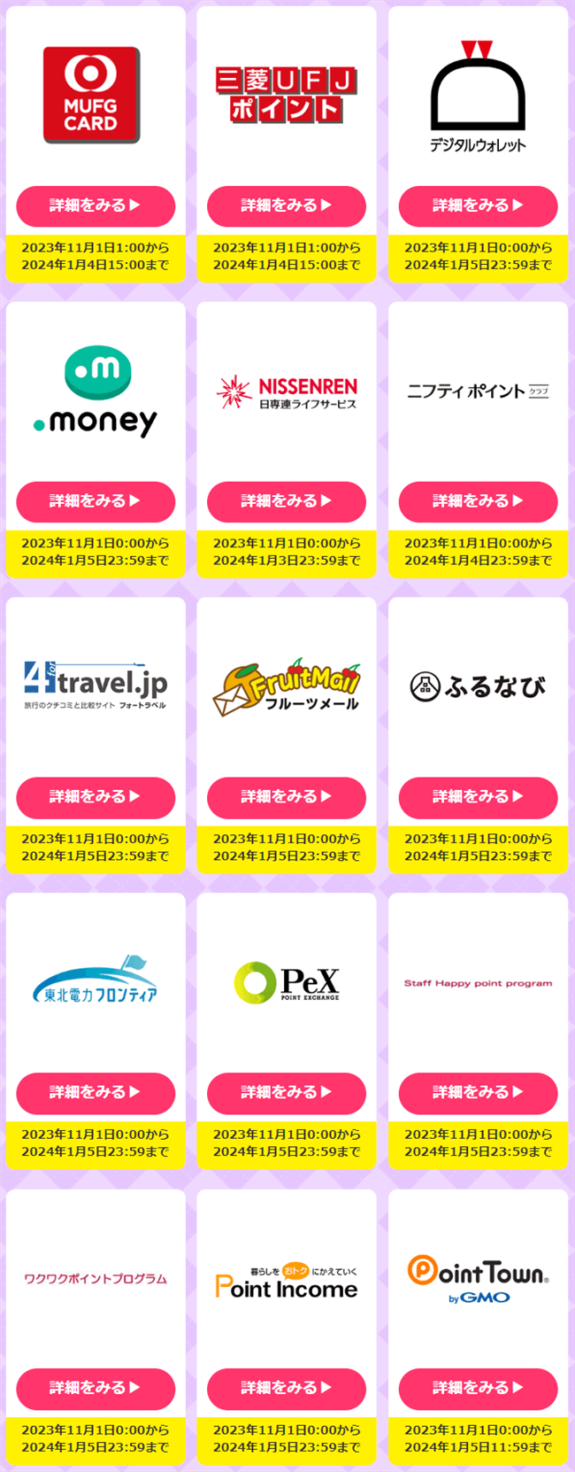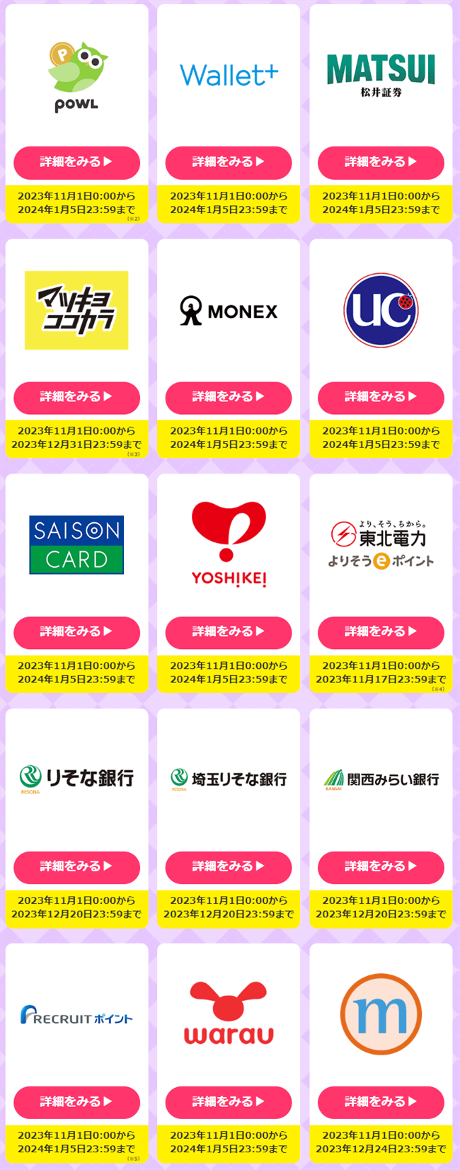ポイント交換は、システム連携上、2023年11月1日(水)10:35~2024年1月6月(土)10:34の受付分が対象となります。