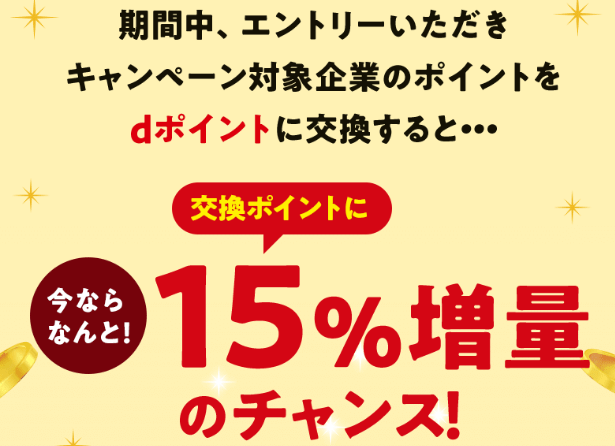 キャンペーン対象企業のポイントをdポイントに交換した場合、15%増量してdポイントに交換が出来るという恐るべしな錬金術キャンペーンとなります。
