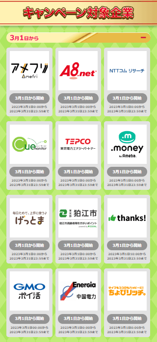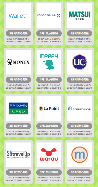 キャンペーン参加企業ごとに注意事項がございます。詳しくは各参加企業のポイントサイトなどご確認ください。