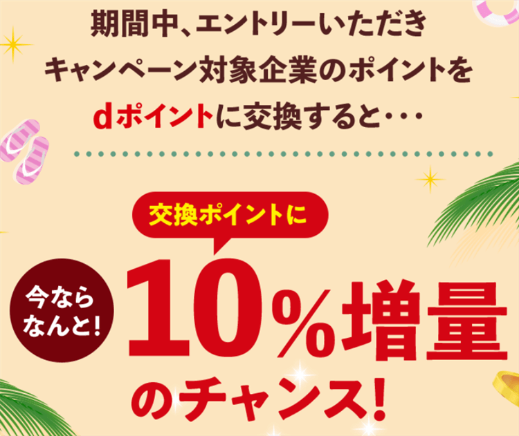 期間中に、キャンペーンサイトから本キャンペーンへエントリーし、本キャンペーン対象企業のポイントからdポイントへの交換をお申込みいただいたお客さまへ、dポイントへの交換が完了したポイントの10%相当をキャンペーンポイントとして進呈します。なお、ポイント交換のお申込みと本キャンペーンへのエントリーの順序は問いません。