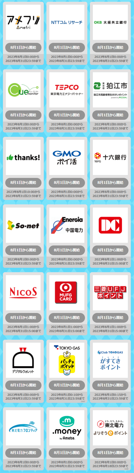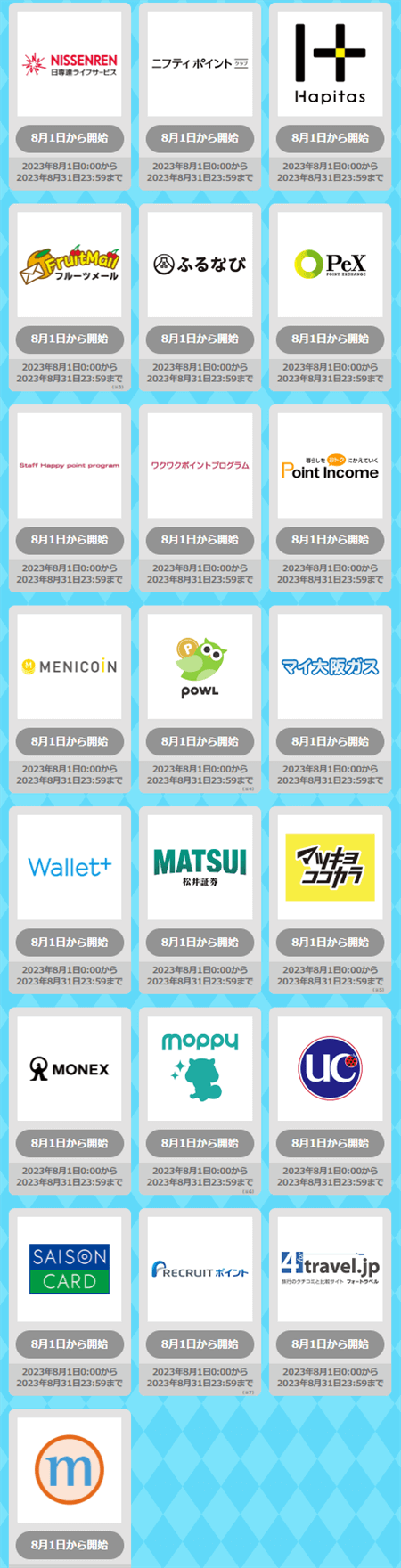 ポイント交換は、システム連携上、2023年8月1日(火)0時10分~2023年9月1日(金)0時09分までの受付分が対象となります。