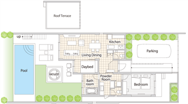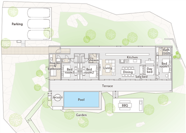 1ベッドルームタイプ![]() | ベッドルーム(ツイン)、デイベッド(ダブル)、プール、ジャグジー、ルーフテラス ・定員:最大4名様 ・客室面積:75.86㎡ ・駐車場:一棟につき1台分 |