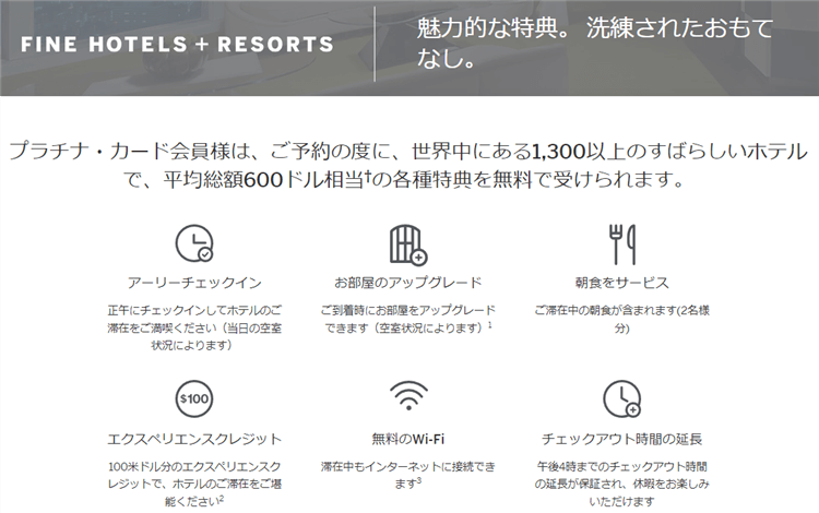 ではアメックスプラチナのFHR(ファイン・ホテル・アンド・リゾート)で受けられるメリットについて見ていきましょう!