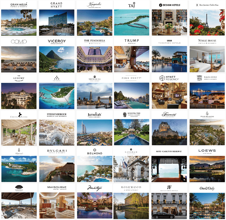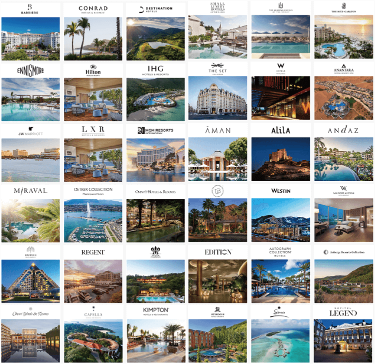 マリオット系列、ヒルトン系列、IHG系列から始まり、帝国やハレクラニ、アマンなど名だたる超ラグジュアリーホテルが揃っています。