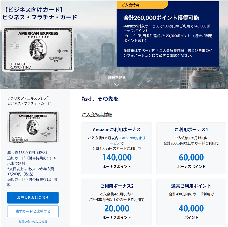 - 4か月以内にAmazon対象サービスで100万円利用で140,000ポイント