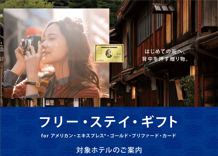 [フリー・ステイ・ギフトのご利用に関するご注意]※1泊食事なしのプランです。※お食事など追加でサービスをご利用された場合、カード会員様ご自身で追加料金をお支払いください。※記載の客室タイプが無料宿泊の対象です。アップグレードをご希望の方は、差額をお支払いいただく事によりご宿泊いただける場合がございます。詳細は各ホテルにお問い合わせください。※基本カード会員様、または家族カード/追加カード会員様ご本人名義での宿泊のみにご利用いただけます。宿泊券は転売したり、第三者(家族カード/追加カード会員様を除く)へ譲渡することはできません。※ご予約の取消・変更は各ホテルが指定する期限内にお手続きください。期限内にお手続きがされなかった場合、宿泊券はご利用済みとしてホテルにご送付いただくか所定のキャンセル料をホテルにお支払いいただきます。※ご宿泊当日時点で宿泊券に記載の対象カードを解約されていた場合、宿泊券はご利用いただけませんのでご注意ください。※ご宿泊当日に宿泊券のご呈示がない場合、ホテル側が定めるご到着日時点の一般販売料金にて宿泊代をホテルにお支払いいただきます。※宿泊券は有効期限を過ぎますとご利用いただけません。必ず有効期限内に完了するご宿泊にご利用ください。※宿泊券の再発行はいたしかねます。また宿泊券の複写はご利用いただけません。※宿泊券の紛失、盗難または滅失などに対して、特典対象ホテルおよび弊社は責任を負いかねますのでご了承ください。※宿泊券を通して提供されたサービスについて問題が生じた場合は、カード会員様と各対象ホテルとの間で解決するものとし、弊社は責任を負いかねます。※ご利用いただける客室には限りがございます。空室状況や除外などの理由により、ご希望に沿えない場合がございますので、あらかじめご了承ください。※「ホテル・メンバーシップ」以外の特典との併用はできません。※対象となるホテル、サービスの内容、対象外日などは予告なく変更・中止となる場合がございます。