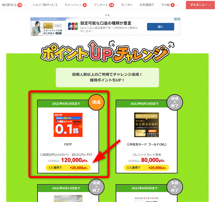 その中に「チャレンジ達成で獲得ポイントUP!」バナーがありますよ!