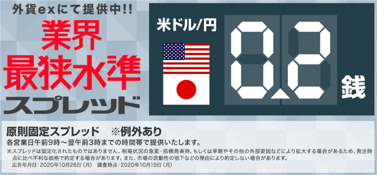 外貨ex byGMOのドル円のスプレッドですが0.2銭となります。