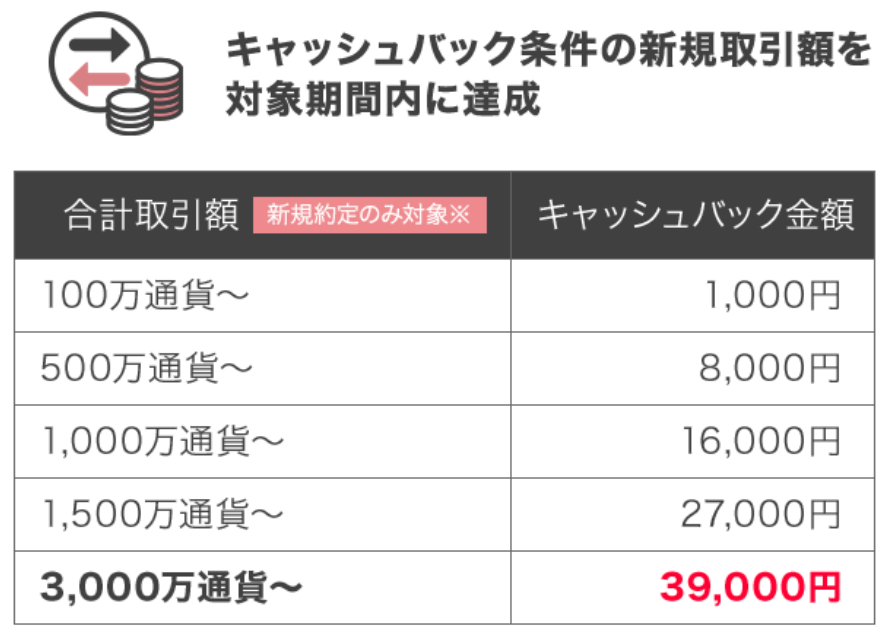 新規口座開設後、新規お取引合計10万通貨完了 (申込から60日以内)