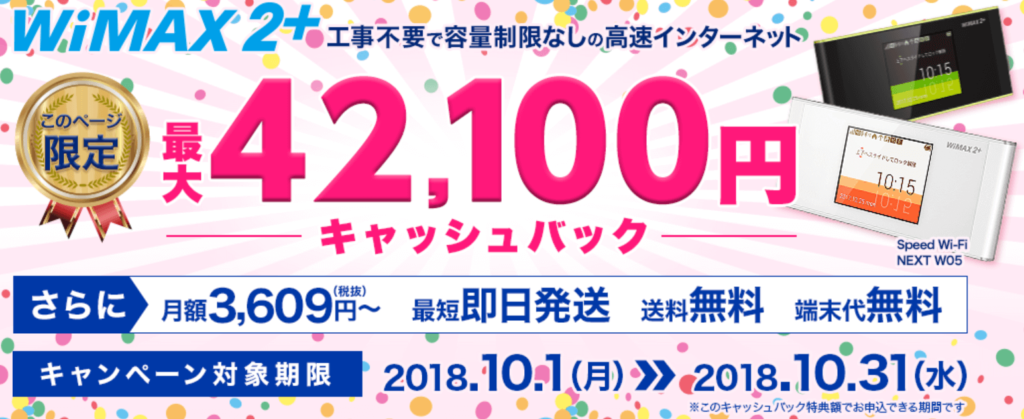 ※GMOとくとくBB WiMAX2+ キャッシュバックキャンペーンお申込み完了後、 WiMAX端末の到着が確認完了でポイント対象となります。