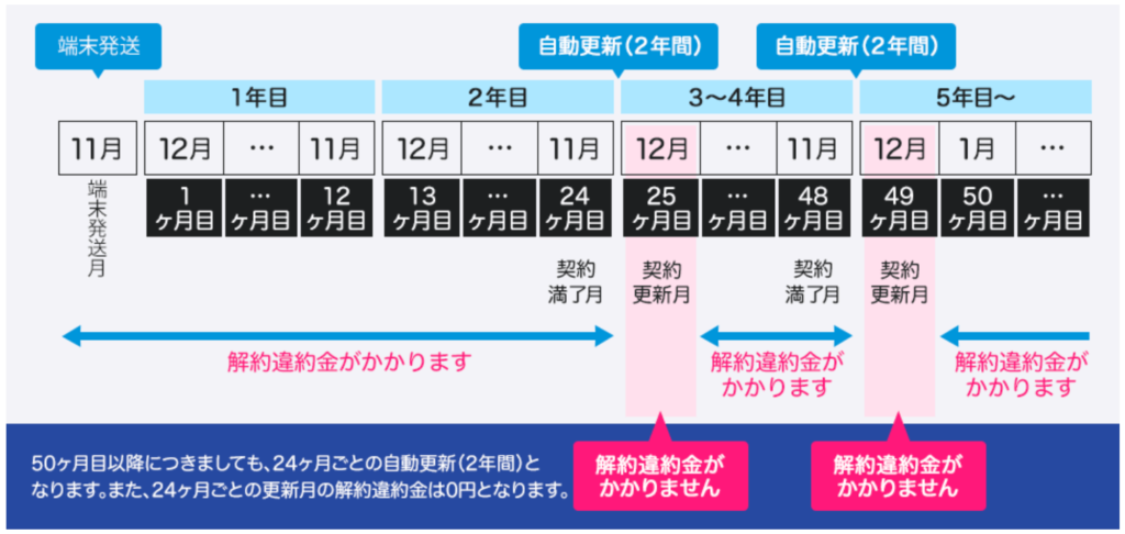 端末発送月の翌月を1ヶ月目とした24ヶ月間を契約期間とし、解約のお申し出がない場合、更に2年間の契約として、自動更新となります。