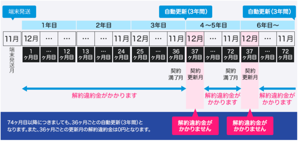 端末発送月の翌月を1ヶ月目として36ヶ月間の契約期間とし、解約のお申し出がない場合、さらに3年間の契約として、自動更新されます。