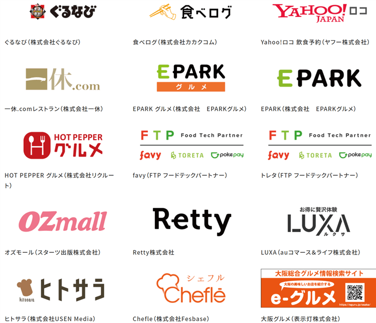Go To イート キャンペーンのオンライン飲食予約の参加事業は全部で13社あります。