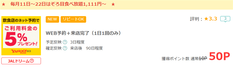 | ランチ10P、ディナー50P別途付与(1人につき)アプリなら2倍 | 翌月10日 | |
