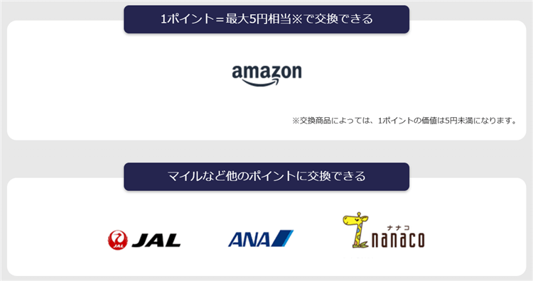 貯めたポイントは各種マイルやポイントに交換が可能となっています。