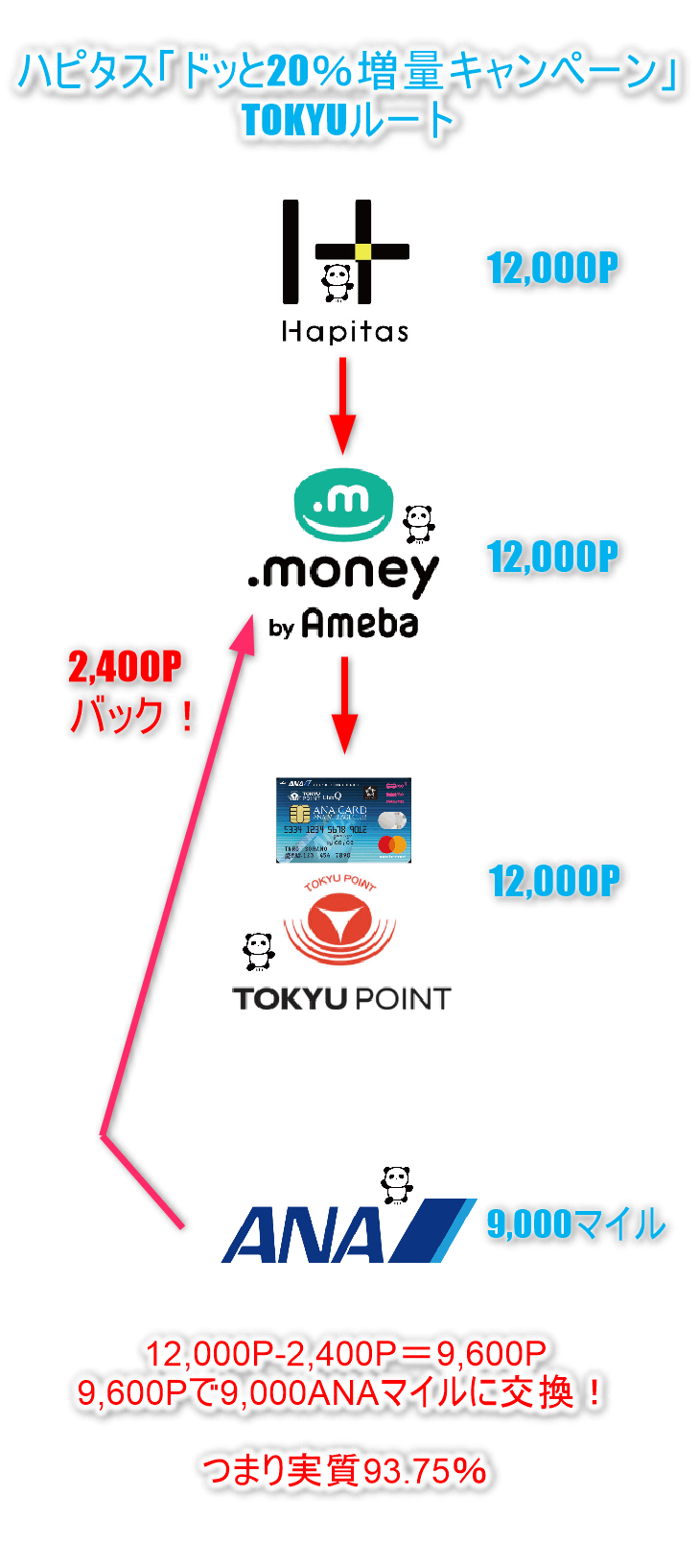 9,600Pが9,000ANAマイルに交換できたものと同じというわけです!!93.75%!!