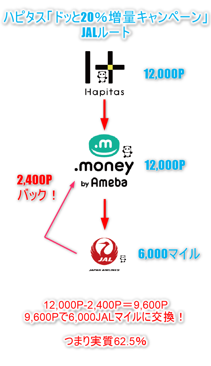 今回のハピタス「ドッと20%増量キャンペーン」で20%の増量ポイントバックということは、JALマイルへの交換は62.5%になるんですよ!